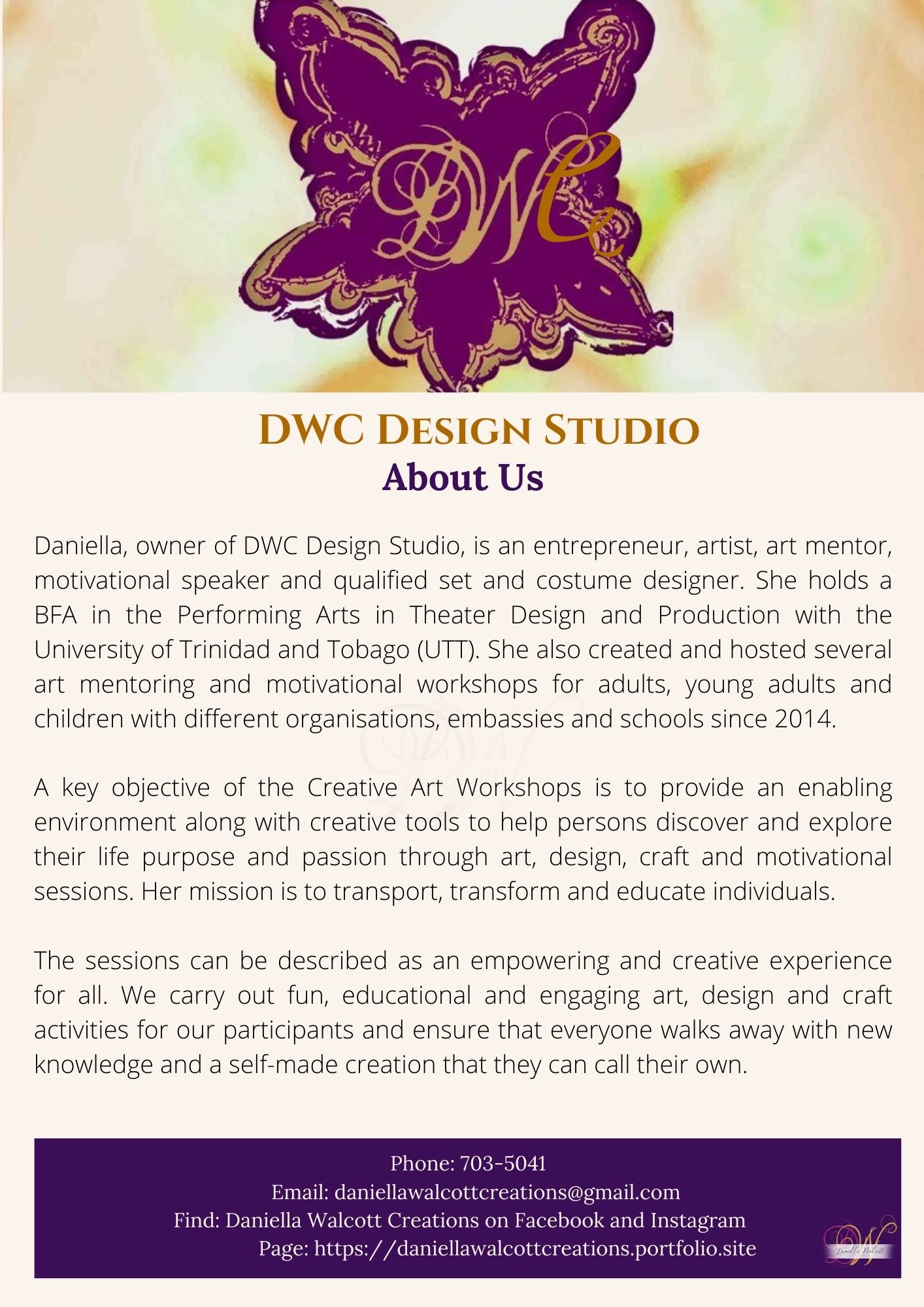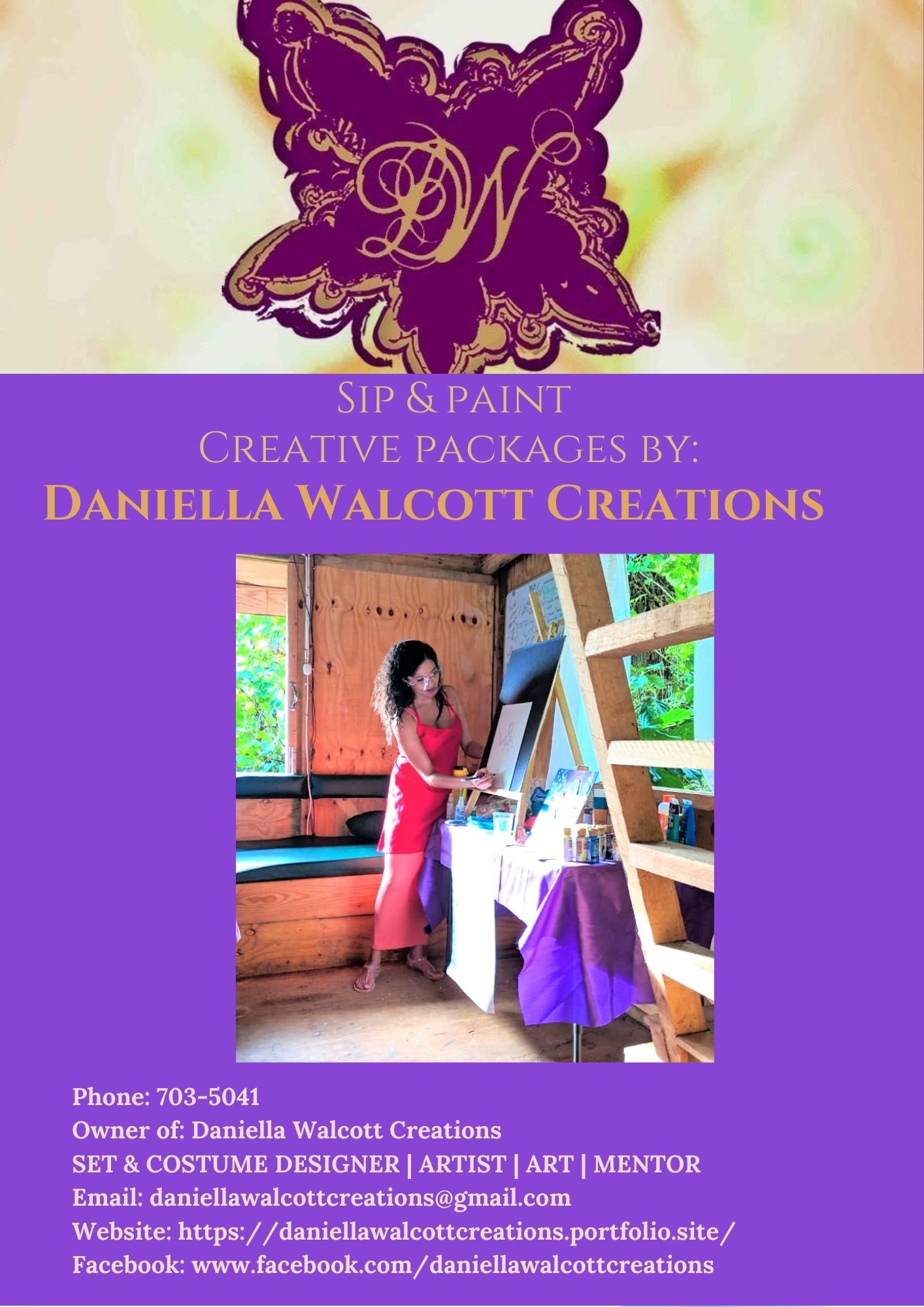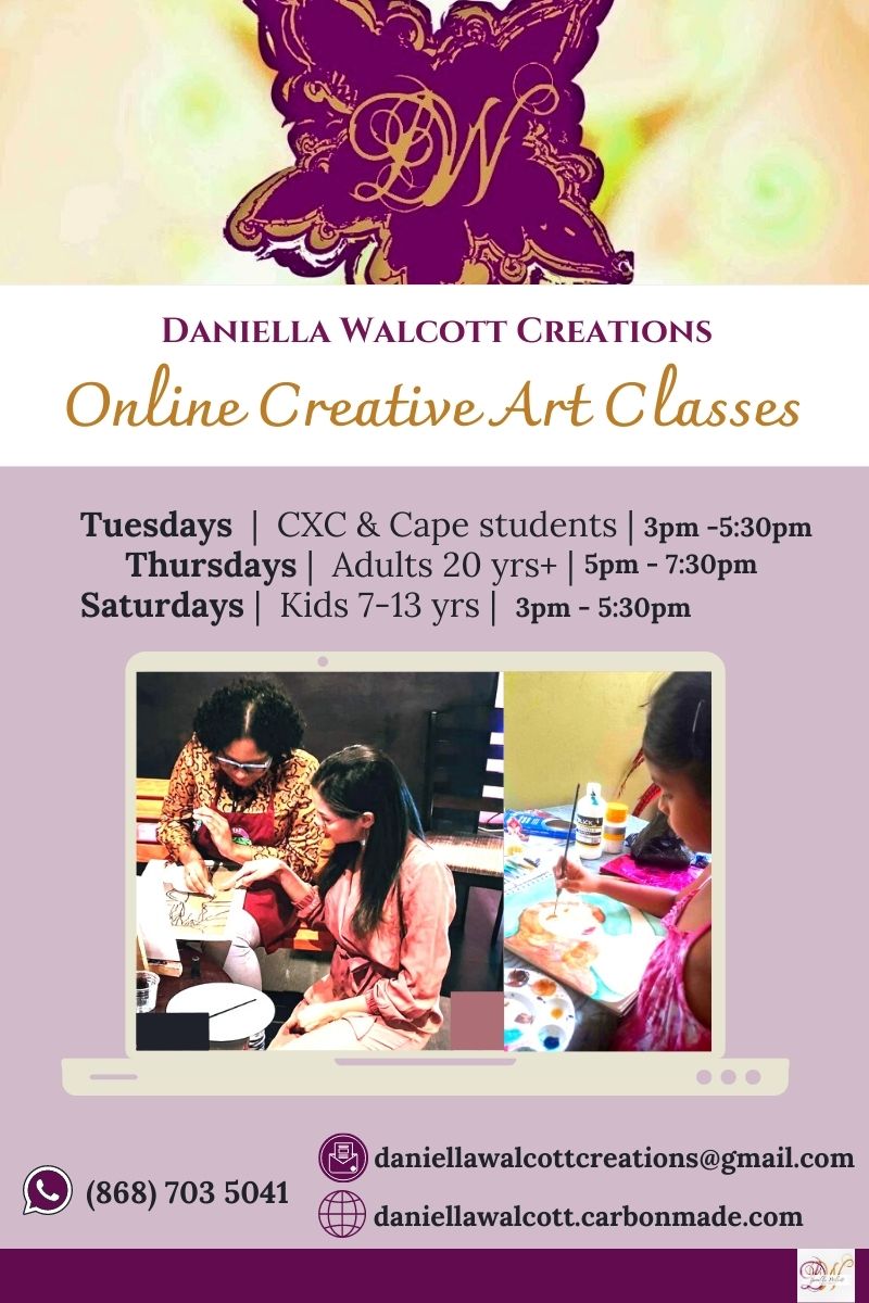 Daniella, owner of Daniella Walcott Creations, is an entrepreneur, artist, art mentor, motivational speaker and qualified set and costume designer. She holds a BFA in the Performing Arts in Theater Design and Production with the University of Trinidad and Tobago (UTT). She also created and hosted several art mentoring and motivational workshops for adults, young adults and children with different organisations, embassies and schools since 2014.