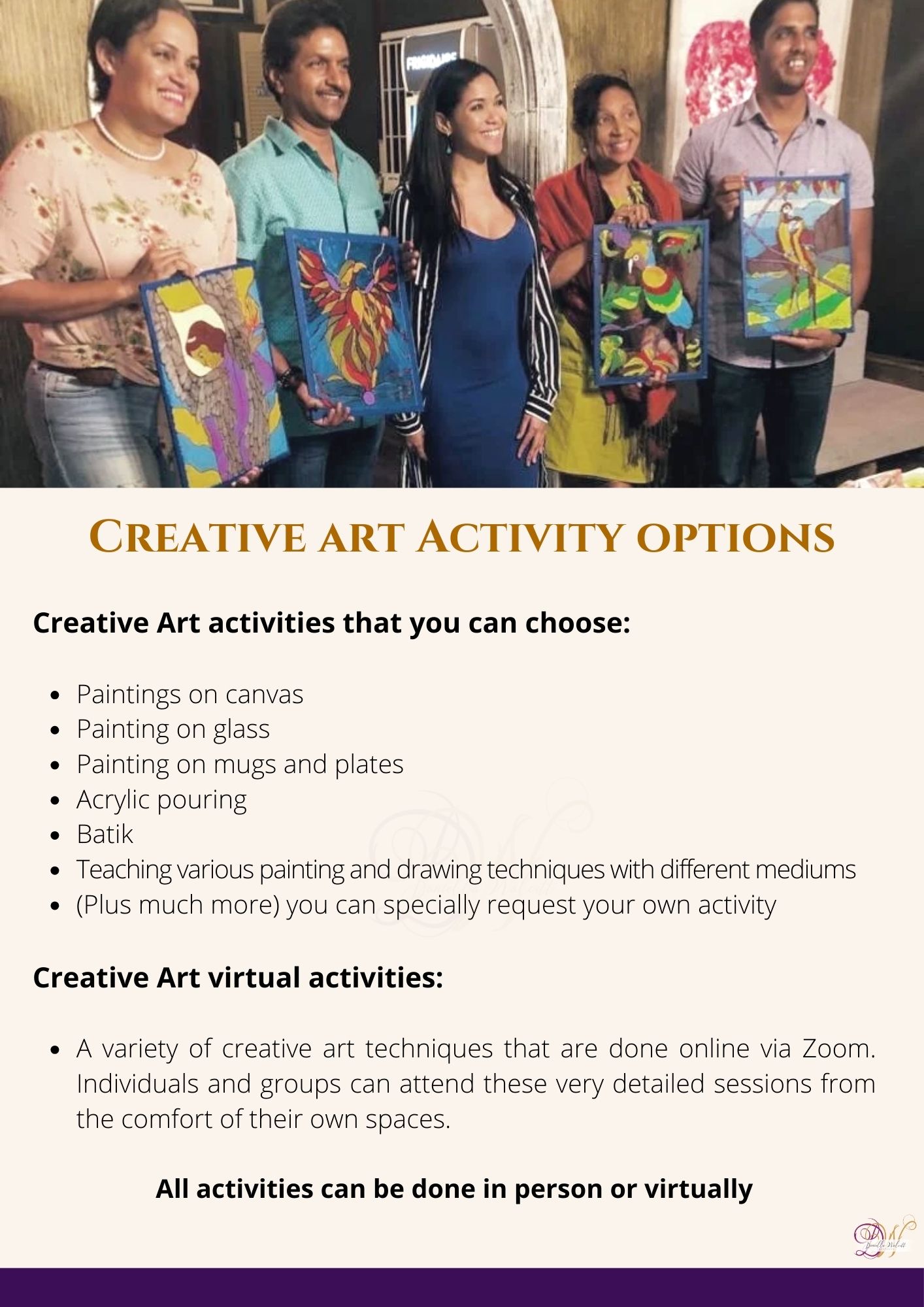 The key objective of the creative Art workshops and Sip and paint activities is to provide an enabling environment along with creative tools to help persons discover and explore their life purpose and passion through art, design, craft classes, motivational sessions.